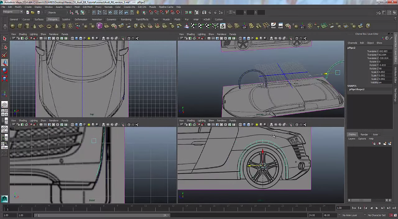 So today I stared work on the wheels of the car on the Audi. As seen in the picture below i have the make the outer part of the wheel in four plains in Maya because if the design seems correct on one side the other side probably isn't right. During this process it took me many times in order to get just the wheel correct on the car but after that I started to under stand the basics of what to do in the four plains.